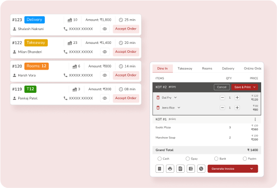 Take table or area-wise orders, print KOT, and accept payment. Manage all online orders, deliveries, and more from one single screen.